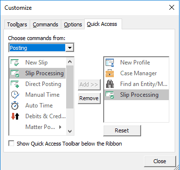 In the above example, I am adding Slip Processing to the Quick Access Toolbar which would be handy for someone based in the Accounts Department tasked with approving posting requests.