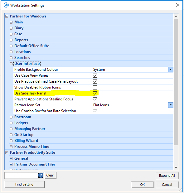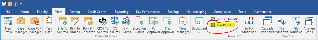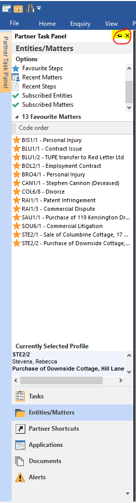 Like the Ribbon Bar, you can choose whether the Task Panel is always visible or disappears from screen until needed. You can do this by clicking on the pin icon when the Task Panel is on screen. Once clicked, the Task Panel slides off to the left of the screen. When you need it again, just hover over the “Partner Task Panel” tab at the left-hand side of the screen and it will slide out again. Once you’ve selected the required option, the Task Panel slides off to the left again.