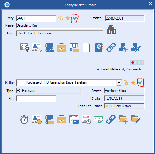 • Entities & Matters: Click the star icon on the Entity/Matter profile screen for the selected entity/matter or the Entity or Matter Properties screen. You can also favourite an entity or matter from the results of a search by right-clicking on the relevant entry and selecting “Add to Favourites.”